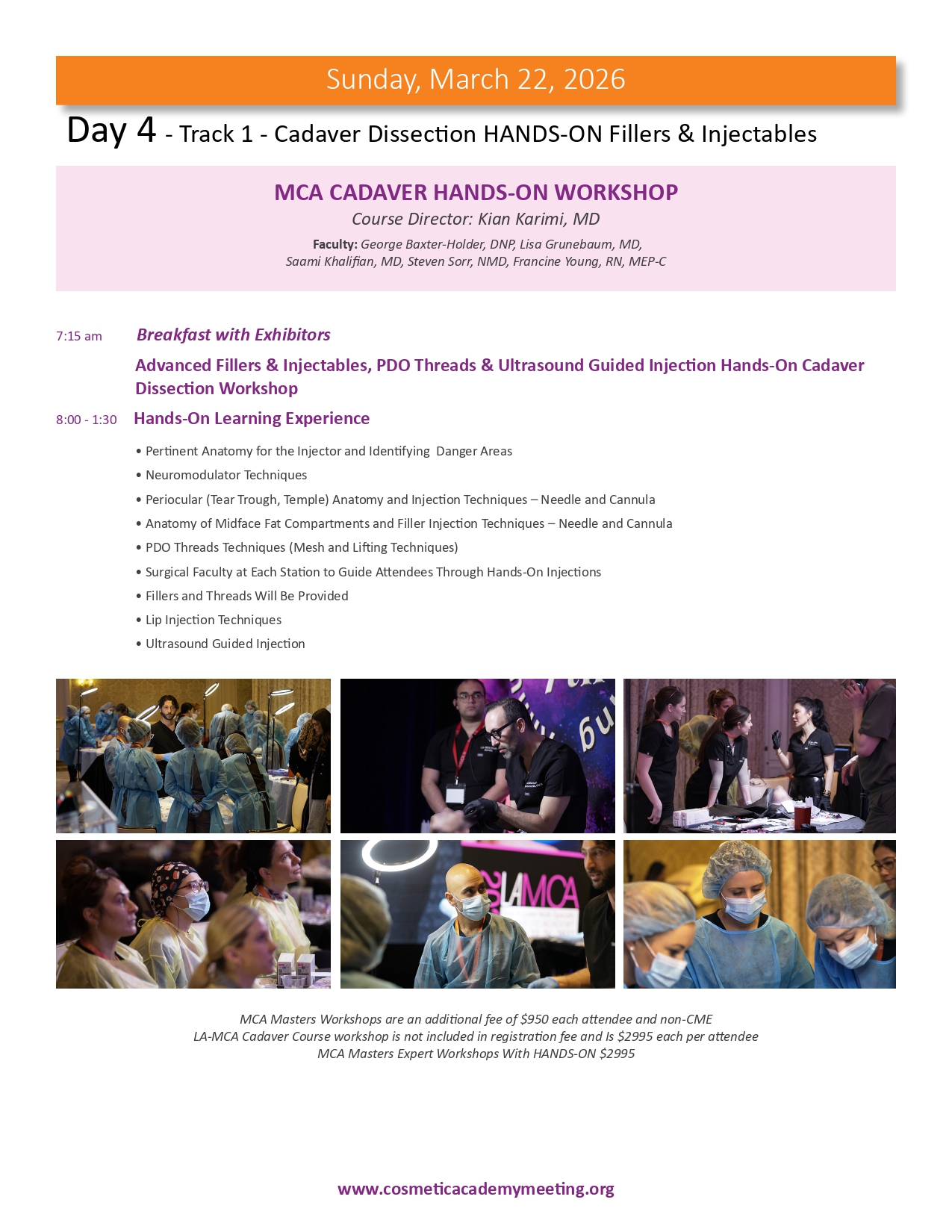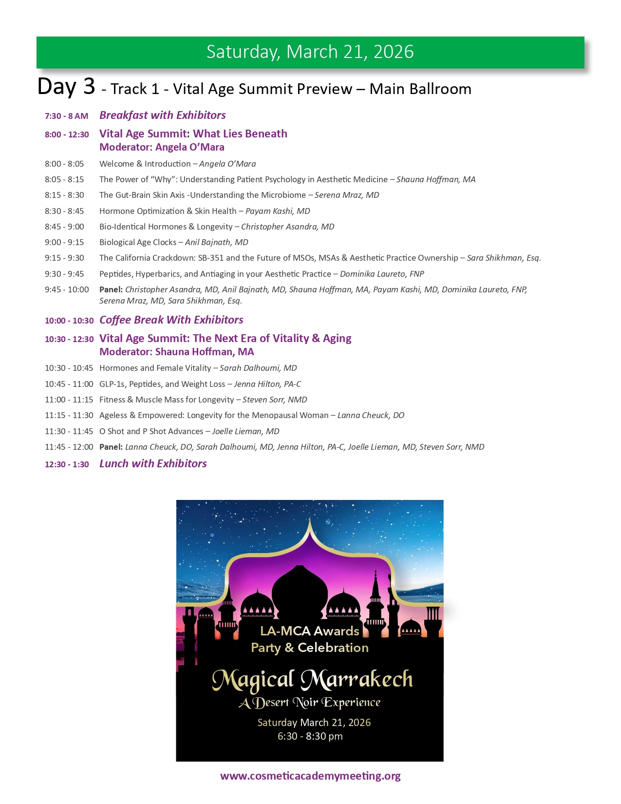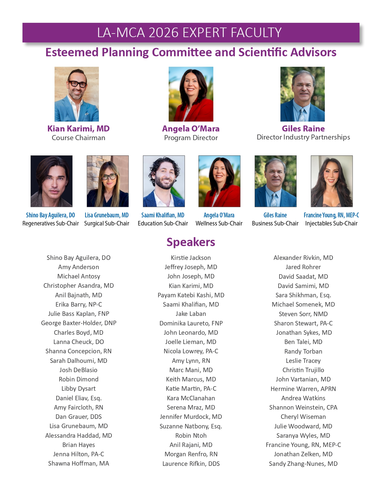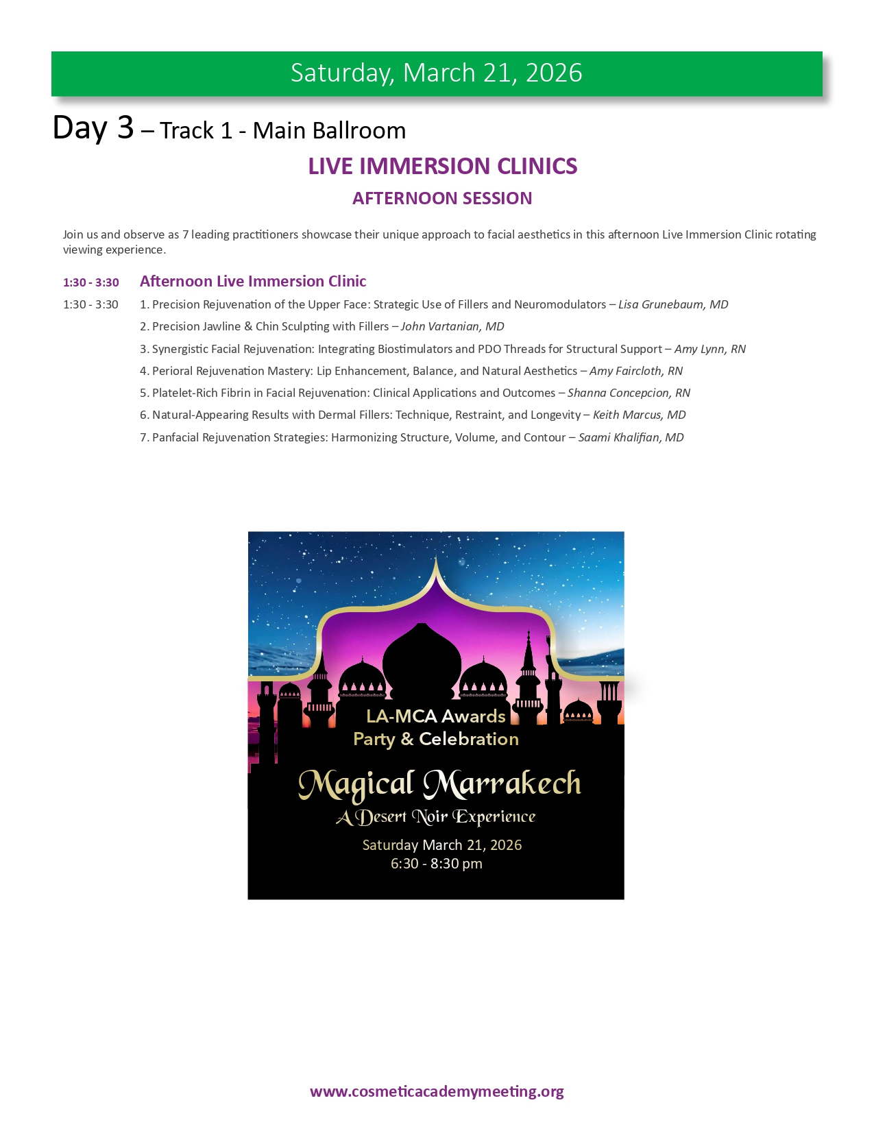 Join us for the highly anticipated LA-MCA 2026 Ninth (9th) Annual Aesthetic Meeting to be held March 19-22, 2026. We are proud to present an exceptional lineup of events designed to elevate your expertise and knowledge in medical aesthetics. With 4 days of didactic sessions, MCA Masters Workshops, a Practice Business & Marketing Track, Live Immersion Observation Clinic, the newly appointed Vital Age Summit and the Skin Care Summit, along with the much sought after MCA Signature Hands-On Cadaver Workshop featuring Injectables, Fillers, Threads and Ultrasound, the 2026 meeting provides a unique opportunity for you to learn from the leading experts in various aesthetic medical specialties. We invite you to delve into advanced techniques, cutting-edge procedures, and innovative approaches that will refine your skills, broaden your horizons and expland your practice to new heights. Our esteemed faculty comprises world-class professionals and thought leaders, ensuring you receive the highest level of education and training from the brightest minds in medical aesthetics. Be part of this extraordinary event and unlock new possibilities for success as you move forth in your aesthetics journey. Register now and secure your place at the forefront of innovation and excellence while space is still available. This meeting will sell out.
