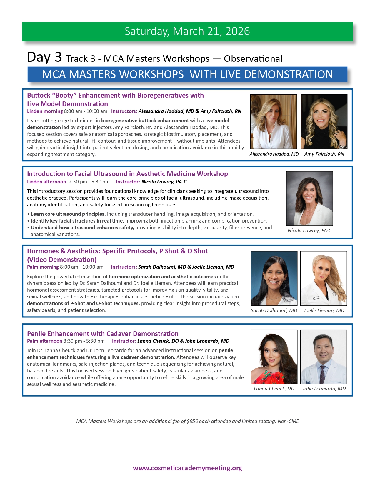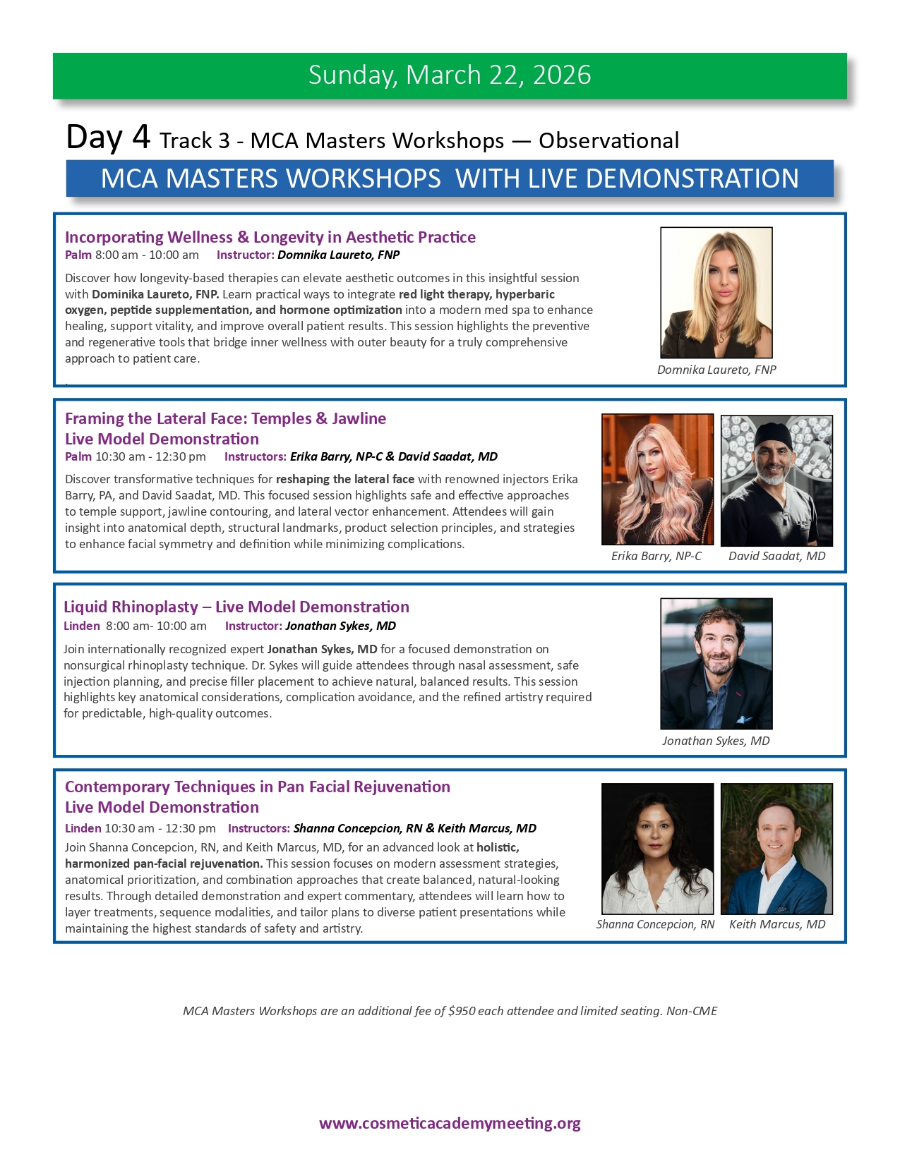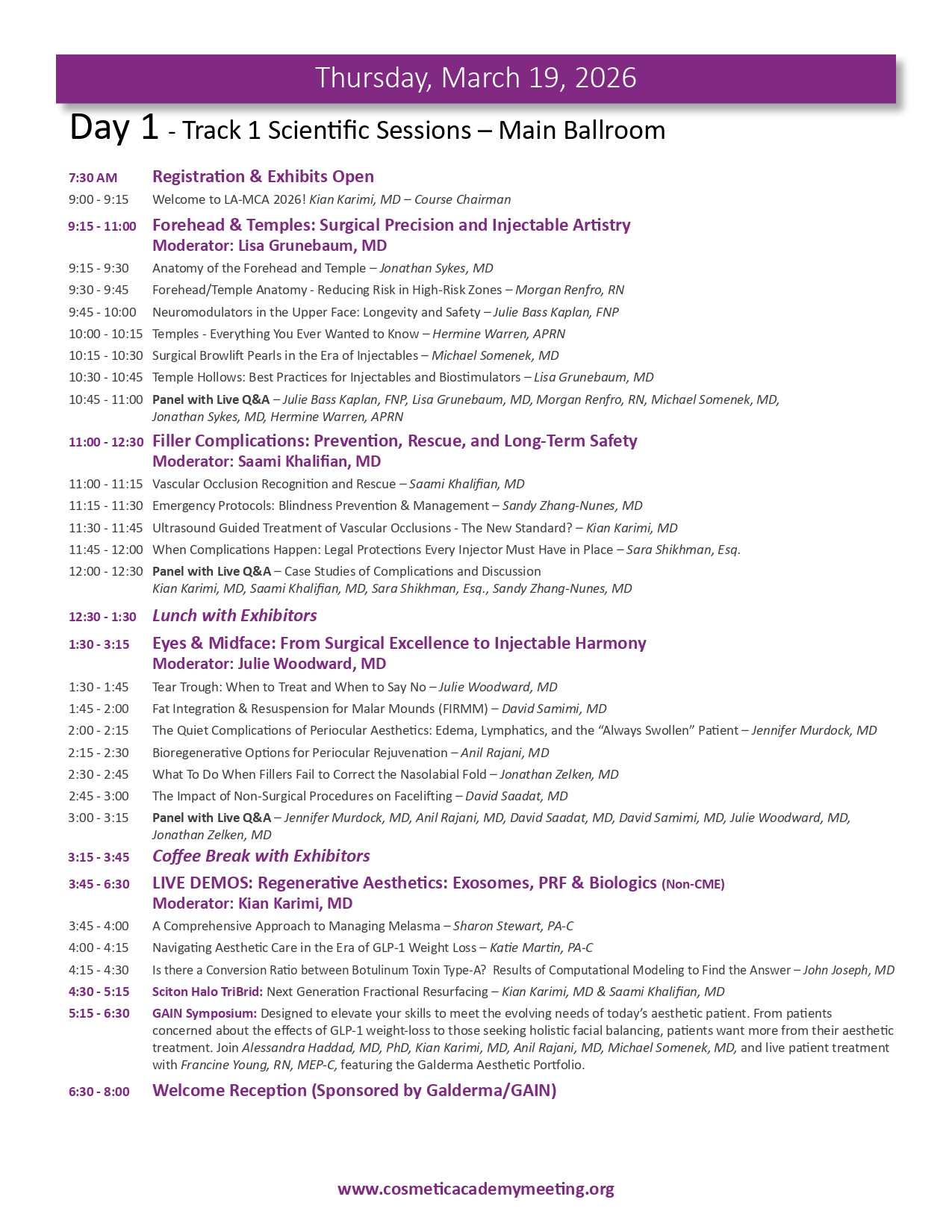 Join us for the highly anticipated LA-MCA 2026 Ninth (9th) Annual Aesthetic Meeting to be held March 19-22, 2026. We are proud to present an exceptional lineup of events designed to elevate your expertise and knowledge in medical aesthetics. With 4 days of didactic sessions, MCA Masters Workshops, a Practice Business & Marketing Track, Live Immersion Observation Clinic, the newly appointed Vital Age Summit and the Skin Care Summit, along with the much sought after MCA Signature Hands-On Cadaver Workshop featuring Injectables, Fillers, Threads and Ultrasound, the 2026 meeting provides a unique opportunity for you to learn from the leading experts in various aesthetic medical specialties. We invite you to delve into advanced techniques, cutting-edge procedures, and innovative approaches that will refine your skills, broaden your horizons and expland your practice to new heights. Our esteemed faculty comprises world-class professionals and thought leaders, ensuring you receive the highest level of education and training from the brightest minds in medical aesthetics. Be part of this extraordinary event and unlock new possibilities for success as you move forth in your aesthetics journey. Register now and secure your place at the forefront of innovation and excellence while space is still available. This meeting will sell out.